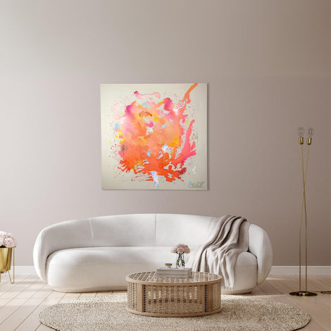Das beeindruckende Kunstwerk mit dem Titel Simply Beautiful, geschaffen auf einer 100x100 Meter großen Leinwand aus rohem Baumwollstoff, fasziniert durch seine fließenden Farbverläufe. Dominierende Töne wie Orange, Rot, Gelb, Rosa und Magenta schaffen eine warme und lebendige Atmosphäre, die dennoch eine sanfte Ruhe ausstrahlt. Die Verwendung von Acrylfarben und Jackson Kreide verleiht der Oberfläche eine einzigartige Textur, die sowohl kraftvoll als auch zart wirkt. Kleine Details, wie die filigrane Darstellung einer Palme, setzen subtile Akzente, ohne die harmonische Gesamtheit zu stören. Simply Beautiful strahlt feminine Eleganz aus und lädt den Betrachter dazu ein, in seine beruhigende und zugleich dynamische Farbwelt einzutauchen.