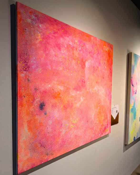 #50 Flow in Neon entfaltet sich als lebendige Bewegung aus Farbe, Licht und Energie. Neonorange und Pink durchziehen die Bildfläche mit kraftvollen Impulsen, während zartes Weiß Raum schafft und die Dynamik trägt.